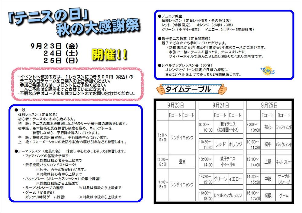 テーマレッスンや、無料体験レッスン、親子テニス、ジュニアハーフデイキャンプなど